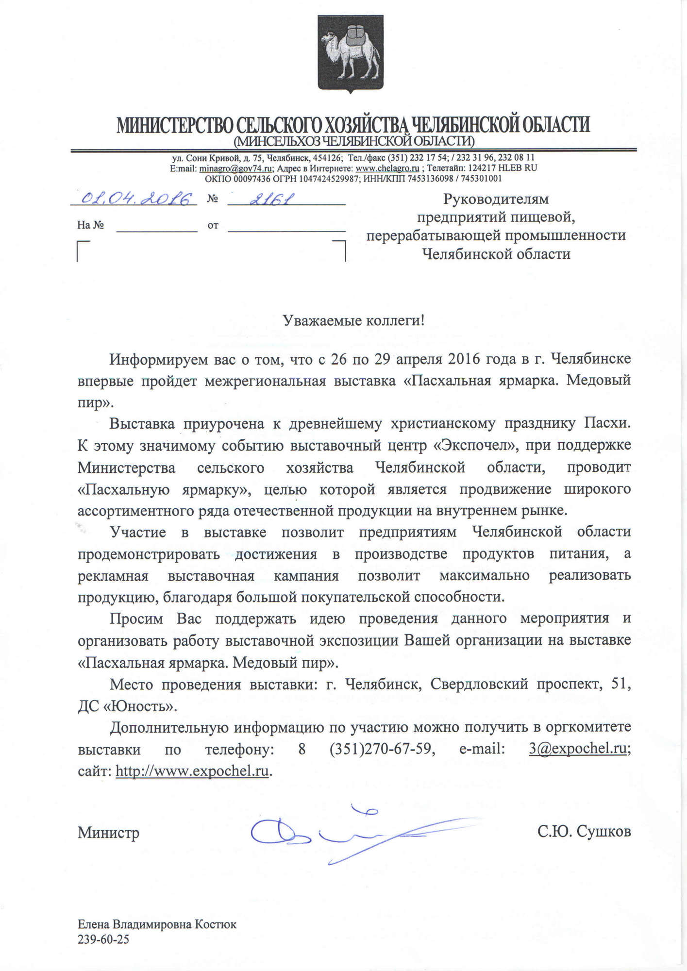 С 26 по 29 апреля во Дворце Спорта «Юность» (Свердловский пр. 51) состоится выставка «Пасхальная ярмарка. Медовый пир». Организаторами выступили: Министерство сельского хозяйства Челябинской области, Управление по торговле и услугам Администрации города Челябинска и ЮУКВЦ «ЭКСПОЧЕЛ».